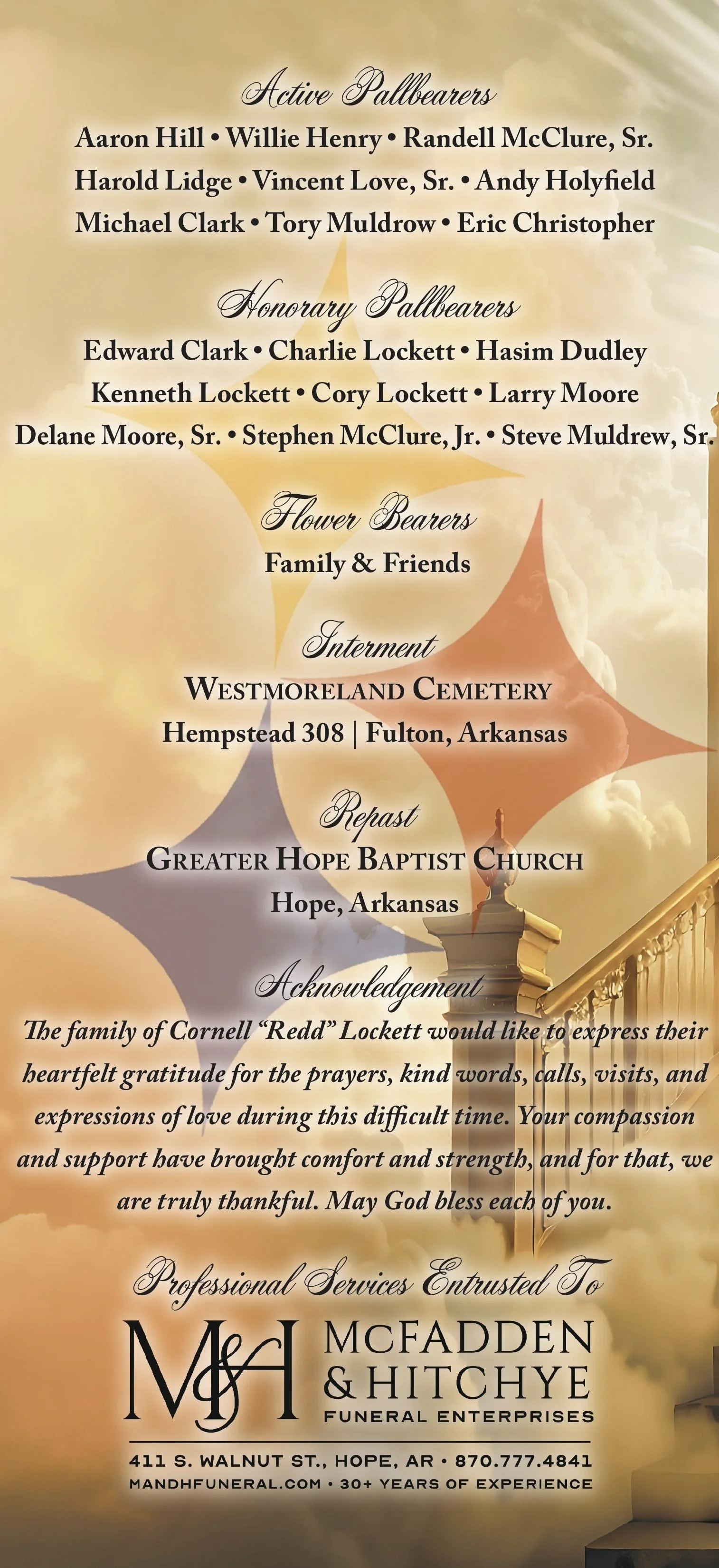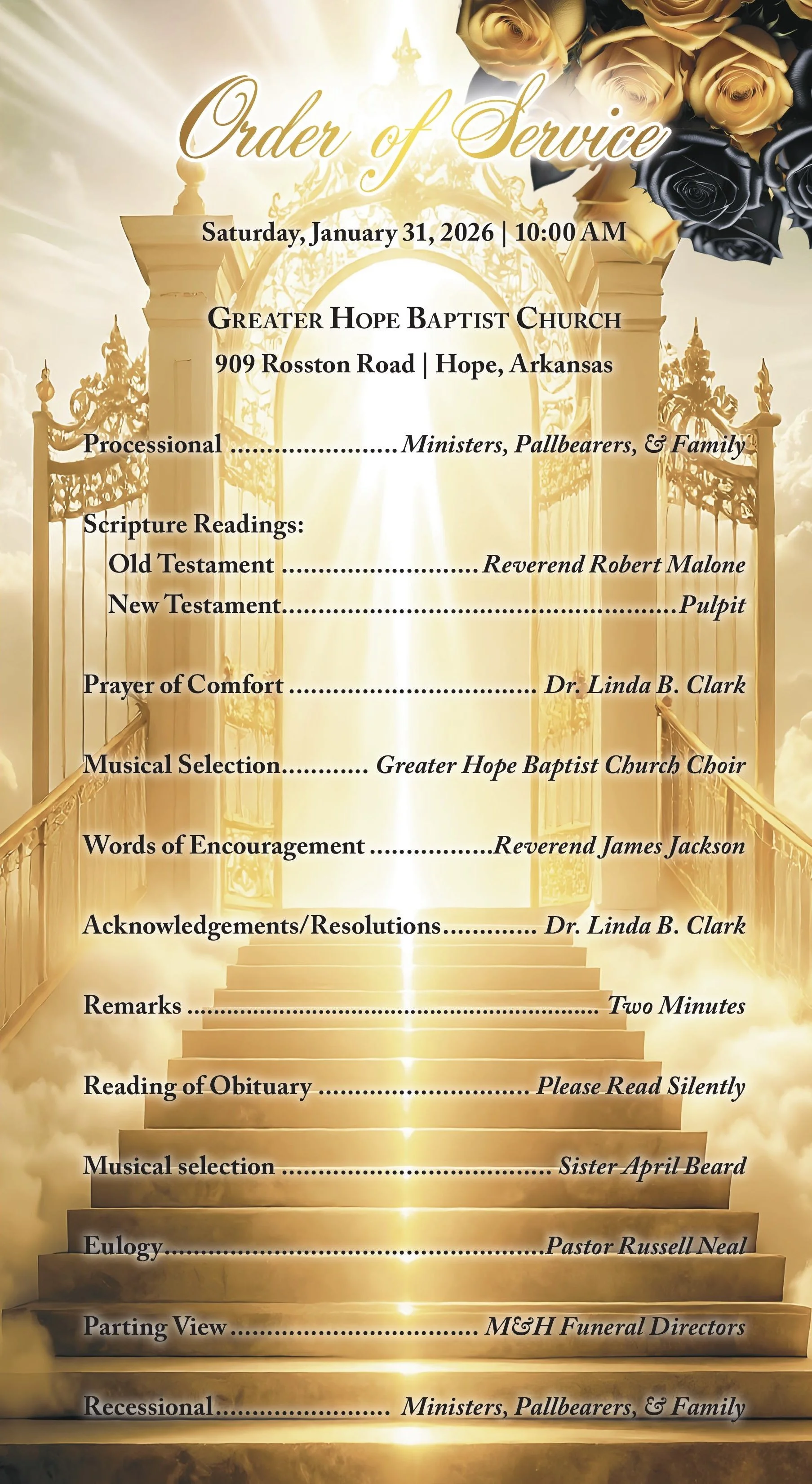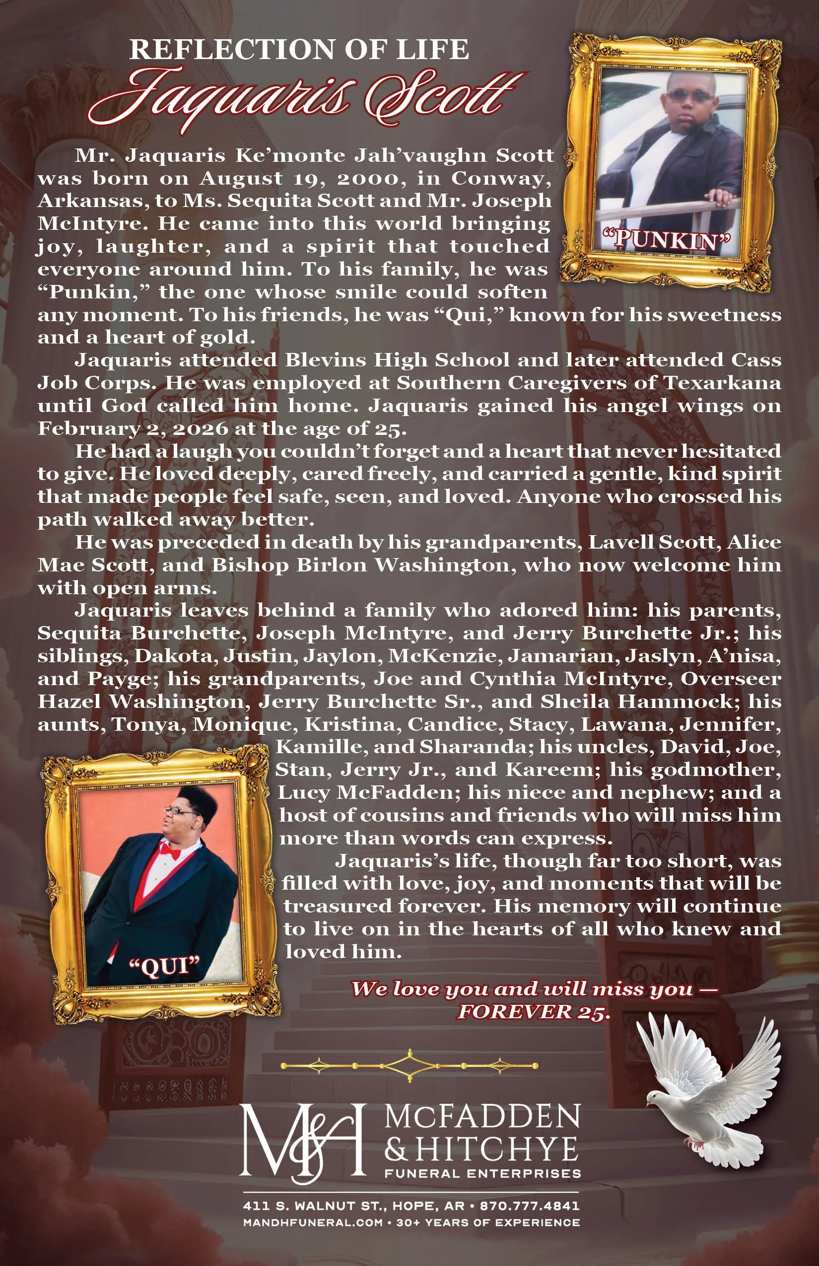 Watch and show your support at McFadden & Hitchye Funeral Enterprises or YouTube (https://www.youtube.com/channel/UCYivdhqz8YMnPq-QGJD8clw).