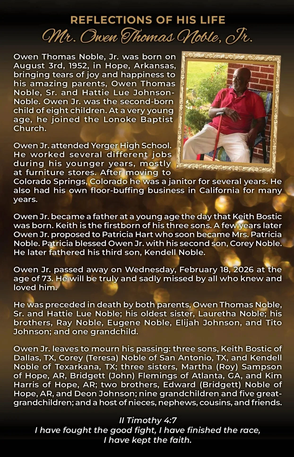Sammy Swan Jr., age 74, a native of Hope, Arkansas, passed away on Monday, November 17, 2025, at United Regional Hospital in Wichita Falls, Texas. May he rest in peace. Service information to follow.